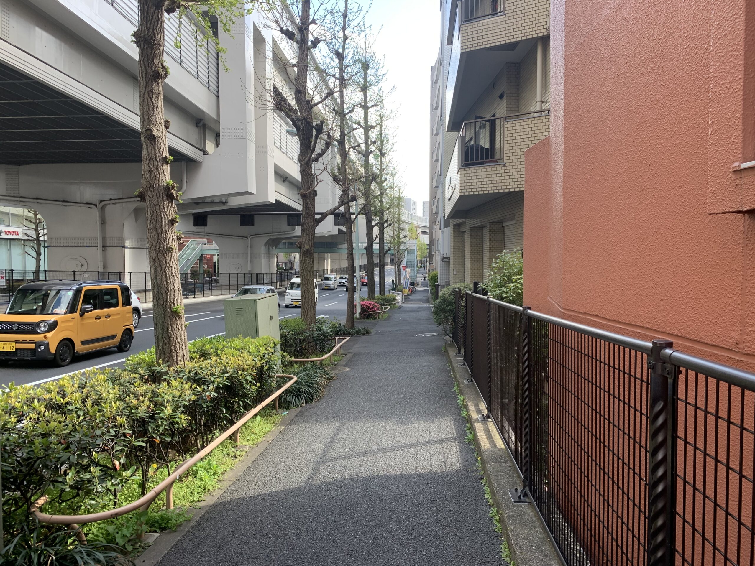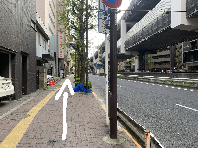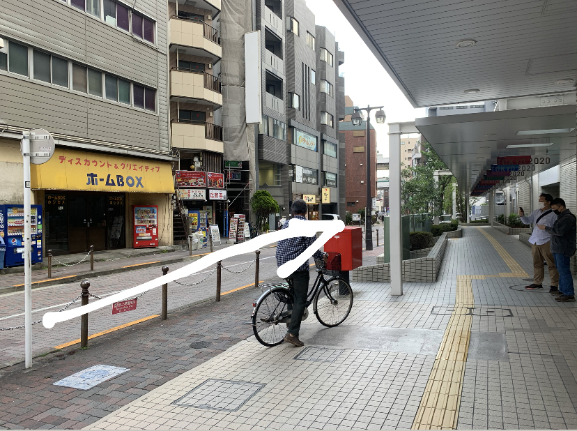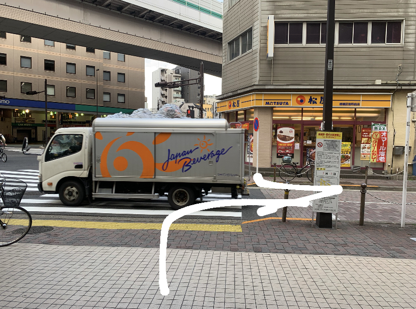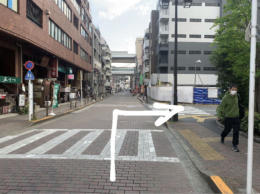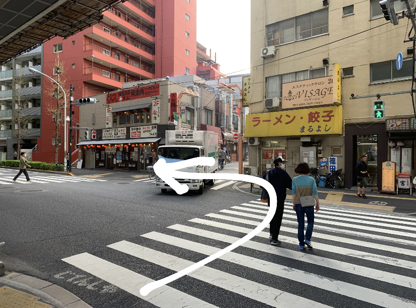 少し歩いて右手に区役所が見えるが、区役所に沿って歩くように右に曲がる。
